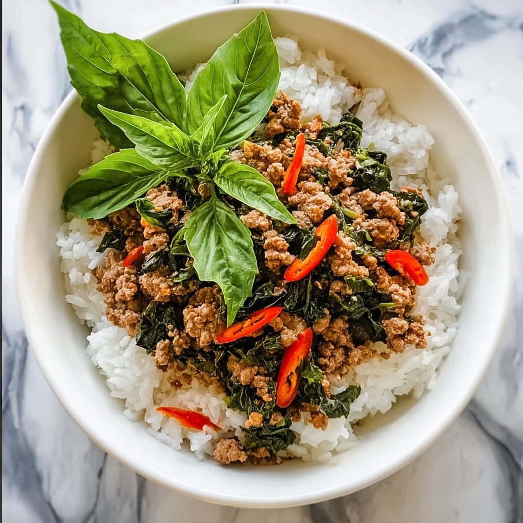 This authentic Thai Basil Chicken recipe is a quick and flavorful stir-fry dish featuring fragrant Thai basil, spicy chilies, and ground chicken. Perfect for a fast weeknight dinner, it combines savory, sweet, and spicy flavors with tender chicken and aromatic herbs.