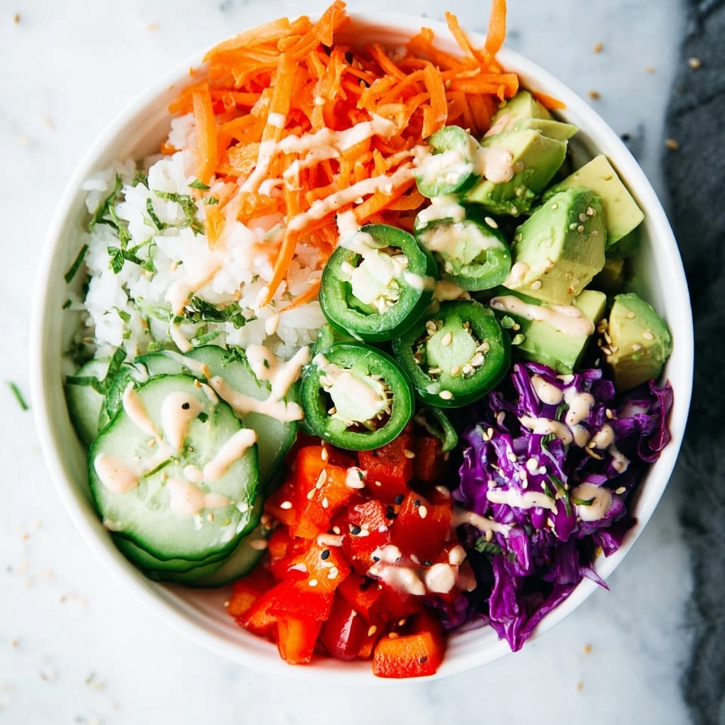 A vibrant and fresh Vegan Sushi Rice Bowl featuring perfectly cooked sushi rice topped with a colorful array of thinly sliced vegetables, fresh basil, and spicy, creamy sauces. This bowl is easy to assemble, packed with flavors, and customizable for a healthy and satisfying meal.