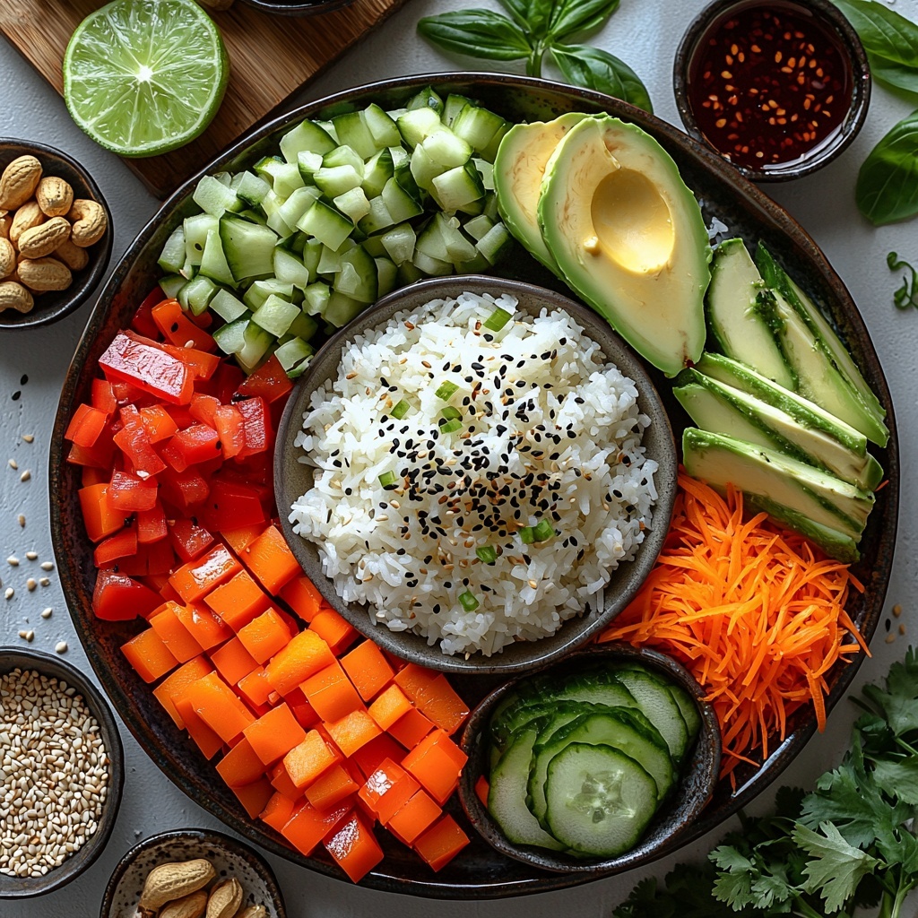 - Prepare Vegetables: Thinly slice and shred all vegetables: red bell pepper, carrots, avocado, cucumber, red cabbage, basil, and jalapeno. Arrange them in individual serving bowls for a sushi bowl bar or set aside for assembly.